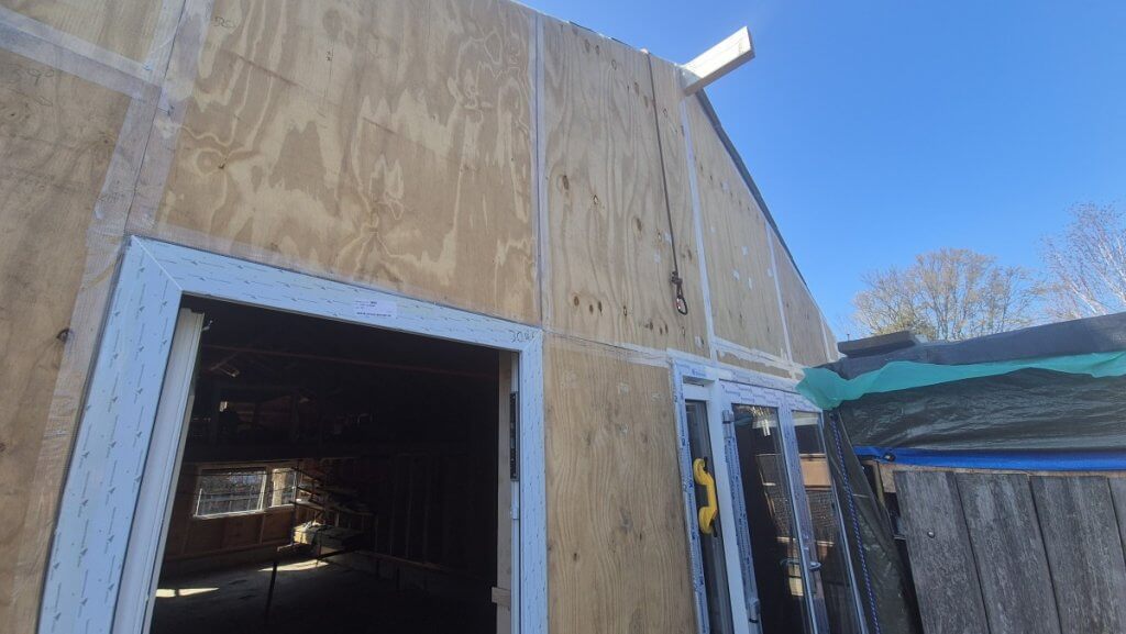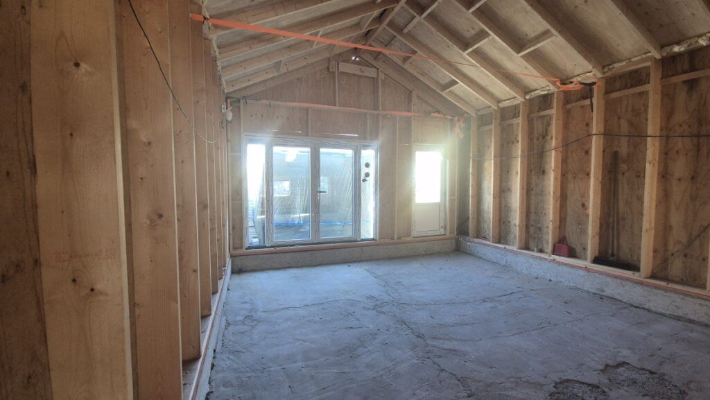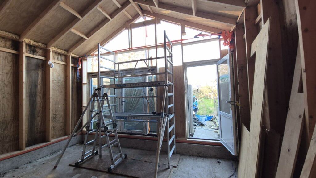 Nadat de eerste muur verrassend soepel overeind stond (bijna verdacht soepel 🤔), was het tijd voor de volgende uitdaging: de muur met ramen en deuren. En ja… dat klinkt simpeler dan het is.