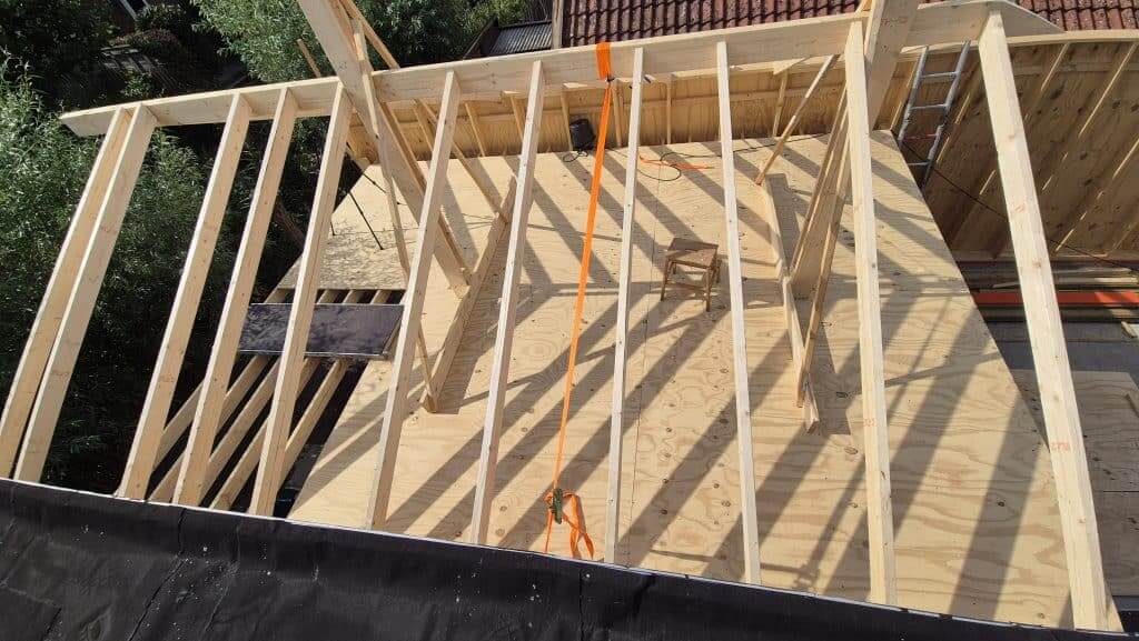 En toen kwam het échte werk: de nokbalk. Een klein stukje hout van… zo’n 80 kilo. 😅 Gelukkig had ik al een etage gebouwd waar hij even mocht uitrusten. Spanten ertegenaan, een beetje duwen, trekken en buigen (hout is namelijk zelden zo recht als je in de winkel denkt 🪵➡️↔️↘️). Maar uiteindelijk stond daar een prachtig raamwerk. Trots! ✨